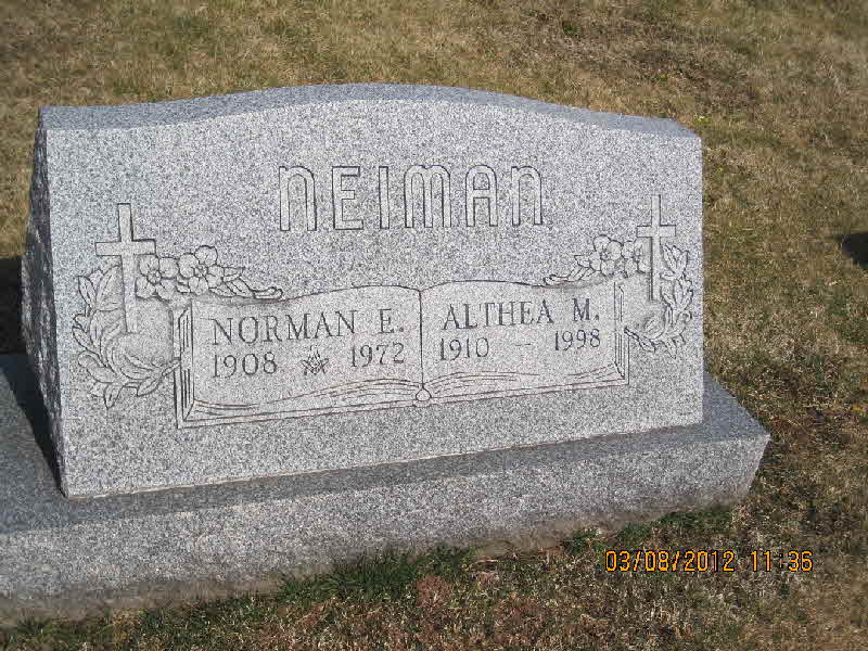 Norman Neiman was born in 1908.1 He married Althea Marie Milley, daughter of Harry S. Milley and Elizabeth Frances Rintz, on 30 August 1930 at Lancaster, Lancaster, Pennsylvania.2 Norman Neiman was buried in 1972 at Emanuel Cemetery, Fairview Township, York, Pennsylvania.1 He died in 1972. Norman Neiman Find-a-Grave.com ID # 86477207.