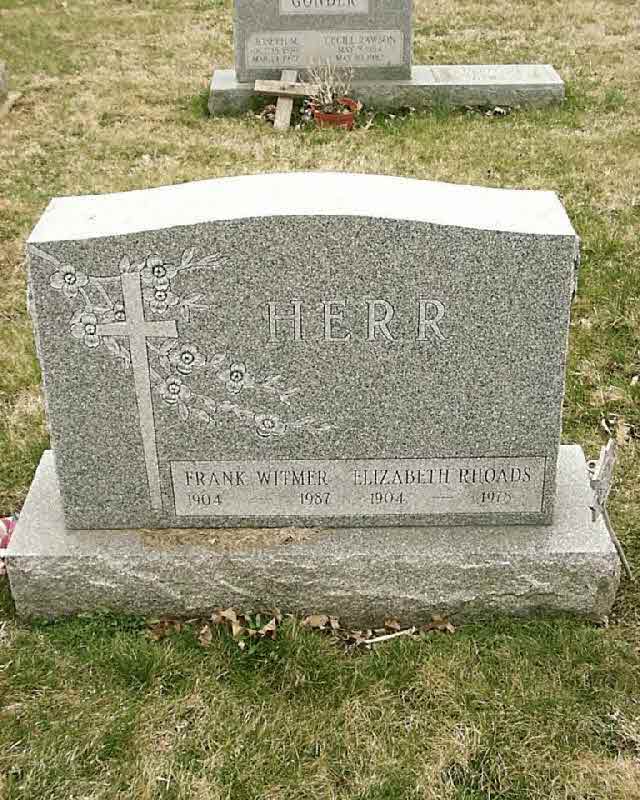 Frank Witmer Herr was born on 30 March 1904 at Pennsylvania.1,2 He married Elizabeth Frances Rhoads, daughter of Charles Hancock Rhoads and Jennie Mae Shaubach, on 1 January 1928.1 Frank Witmer Herr died on 3 January 1987 at Lancaster, Pennsylvania, at age 82.1 He was buried on 6 January 1987 at Strasburg Cemetery, Strasburg, Lancaster, Pennsylvania.1