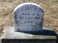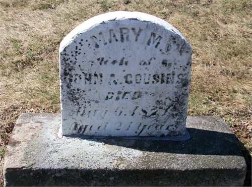 Mary Melissa Moore was born in July 1846 at Porter Township, Clarion, Pennsylvania.2 She was born in 1847 at Pennsylvania.3 She married John A Cousins, son of Isaac Cousins and Jane (Jennie) Henry, in 1866.1,4 Mary Melissa Moore died on 6 May 1871 at Dee, Armstrong, Pennsylvania. Pension record states death as May 8 1871. Her cause of death was childbirth according to family lore. Same is stated in Robert Dunn family history documents.3,5,6,4 She was buried on 9 May 1871 at Oakland Cemetery, Distant, Armstrong, Pennsylvania.3 Mary Melissa Moore Find-a-Grave.com ID # 48001810.