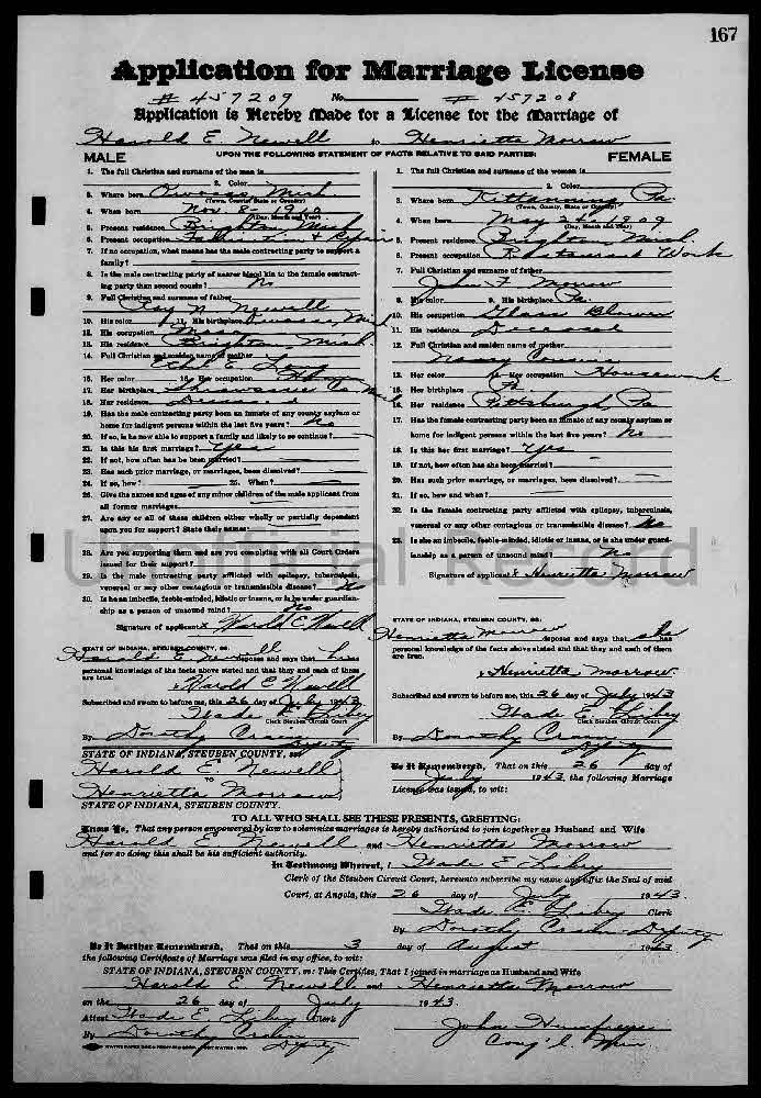 - [S233] Certificate, Various marriage of Various, Researched Feb 1, 2015 @ MyHeritage.com. Marriage of son Harold E Newell & Henrietta Morrow.