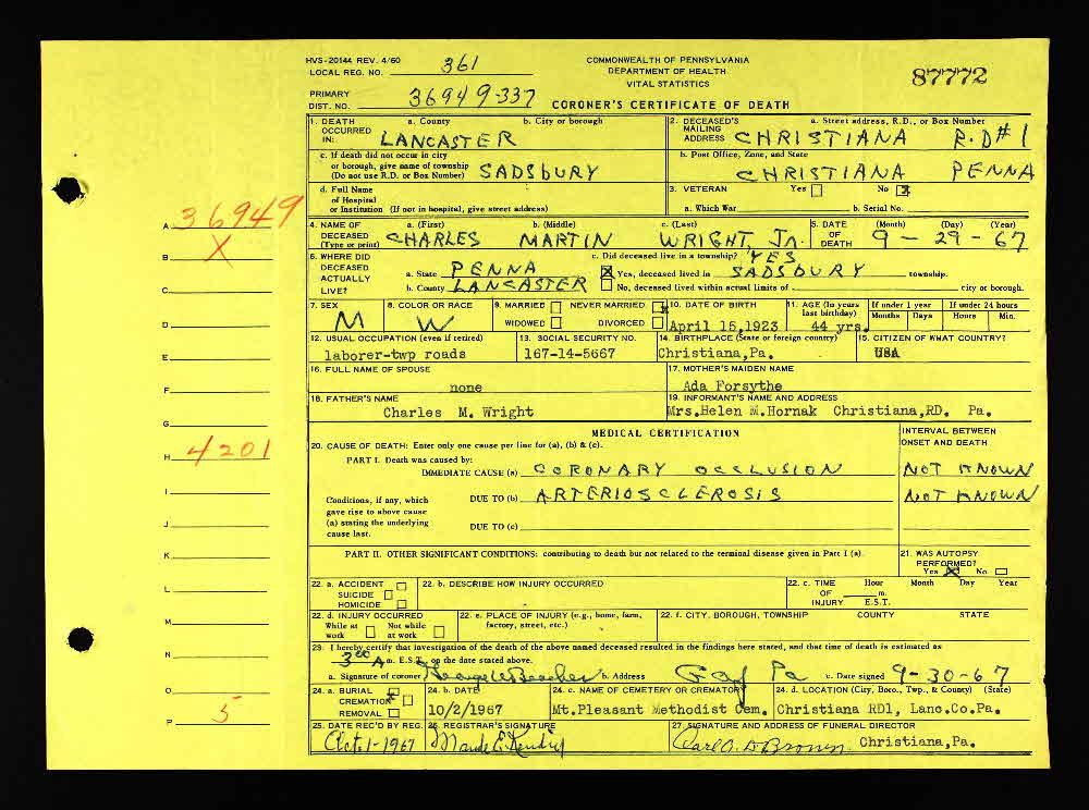 Death certificate for John Patrick Sharrer, descendant of Lucy Longstreth